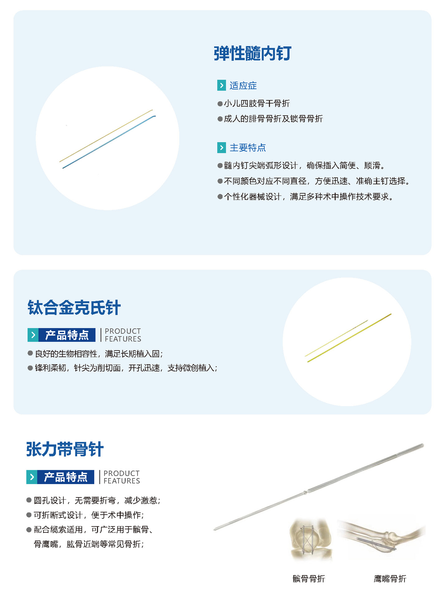 金屬骨針該產(chǎn)品采用符合GB/T13810標(biāo)準(zhǔn)規(guī)定的TC4鈦合金材料制成。適用于四肢骨折復(fù)位時部分植入人體做牽引或四肢骨折內(nèi)固定。注冊證號:國械注準(zhǔn)20203130290